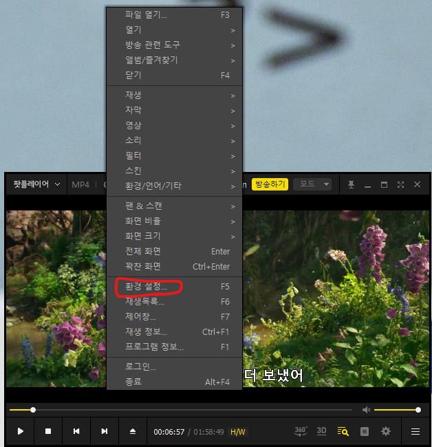 다음 팟플레이어에서 오른쪽 마우스 클릭을 하게 되면 환경 설정 창이 나타난다.