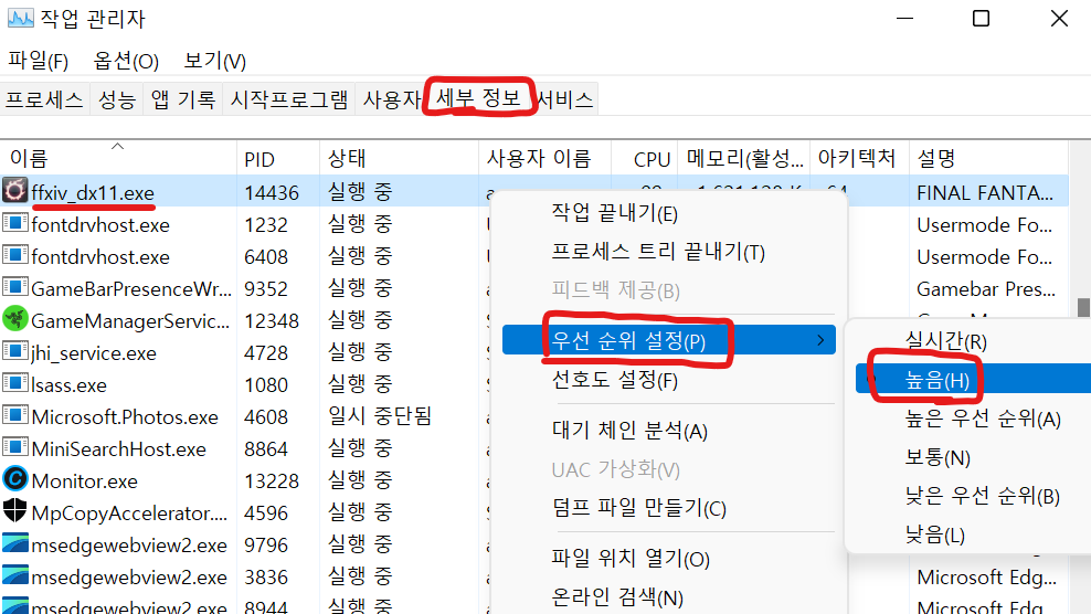 그리고 오른쪽 클릭하면 우선 순위 설정이 있는데 높음으로 설정해주자.