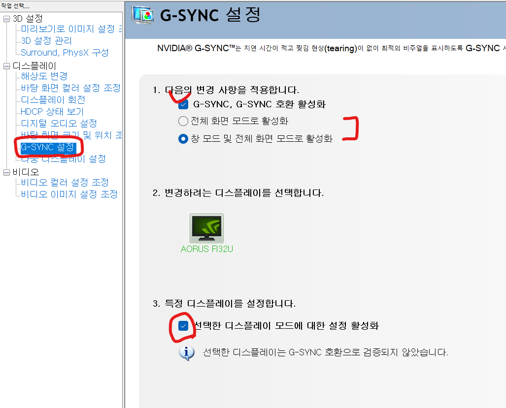 체크를 해줘야지만 G-SYNC가 정확히 돌아간다.
