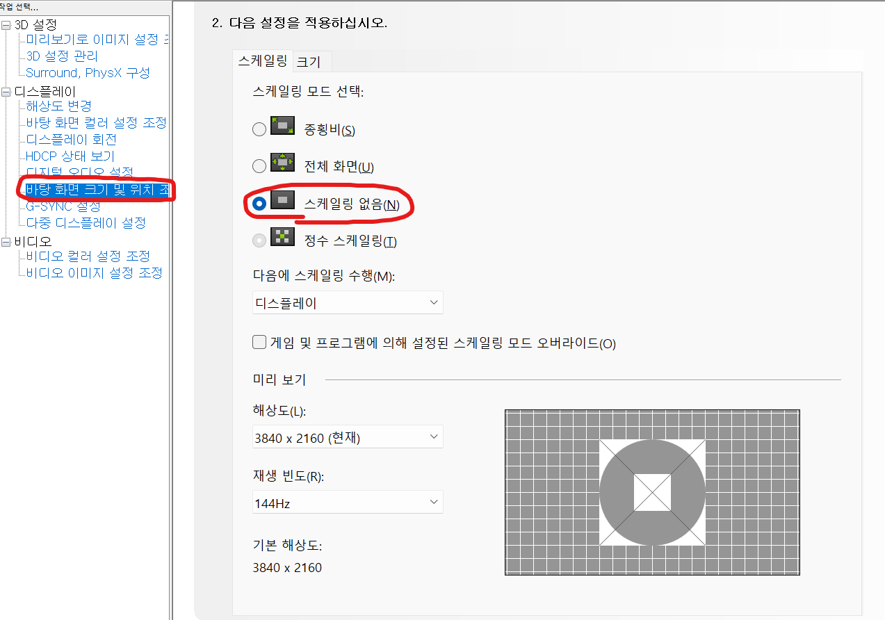 바탕 화면 크기 및 위치 조정 -> 스케일링 없음 으로 해주자.