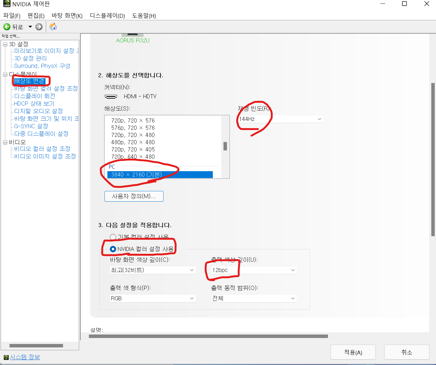 나는 FI32u 모니터를 쓰고 있어서 4k 해상도에 144hz로 설정해뒀다.