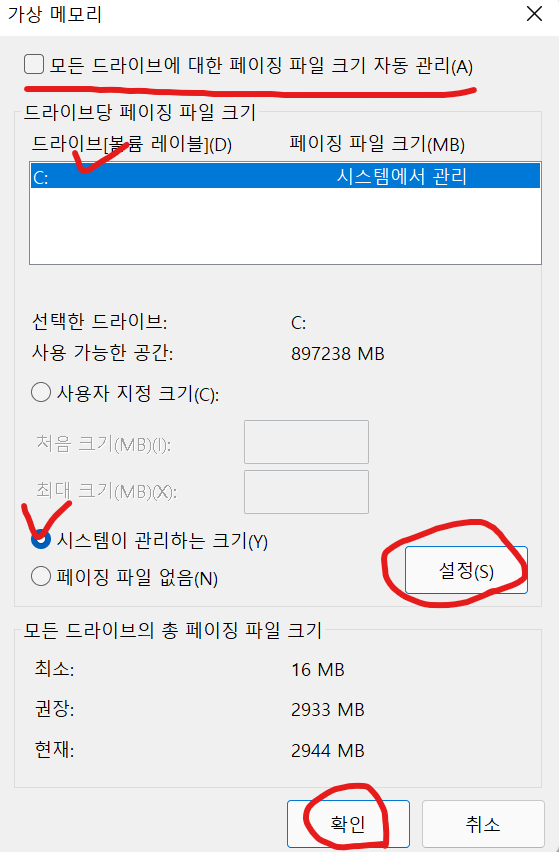 모든 드라이브에 대한 페이징 파일 크기 자동 관리 체크해제 하고