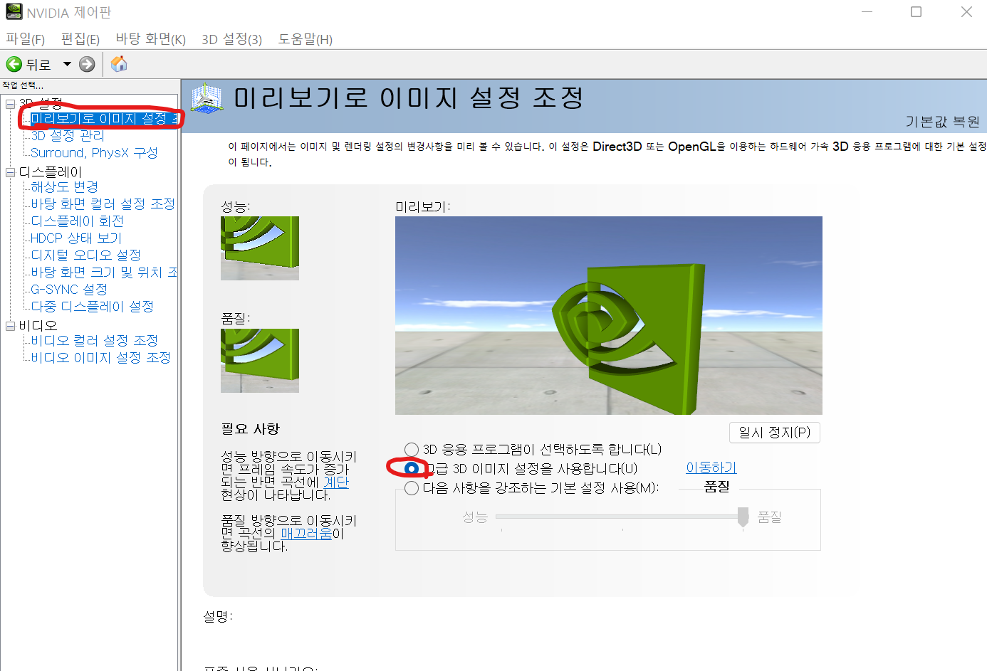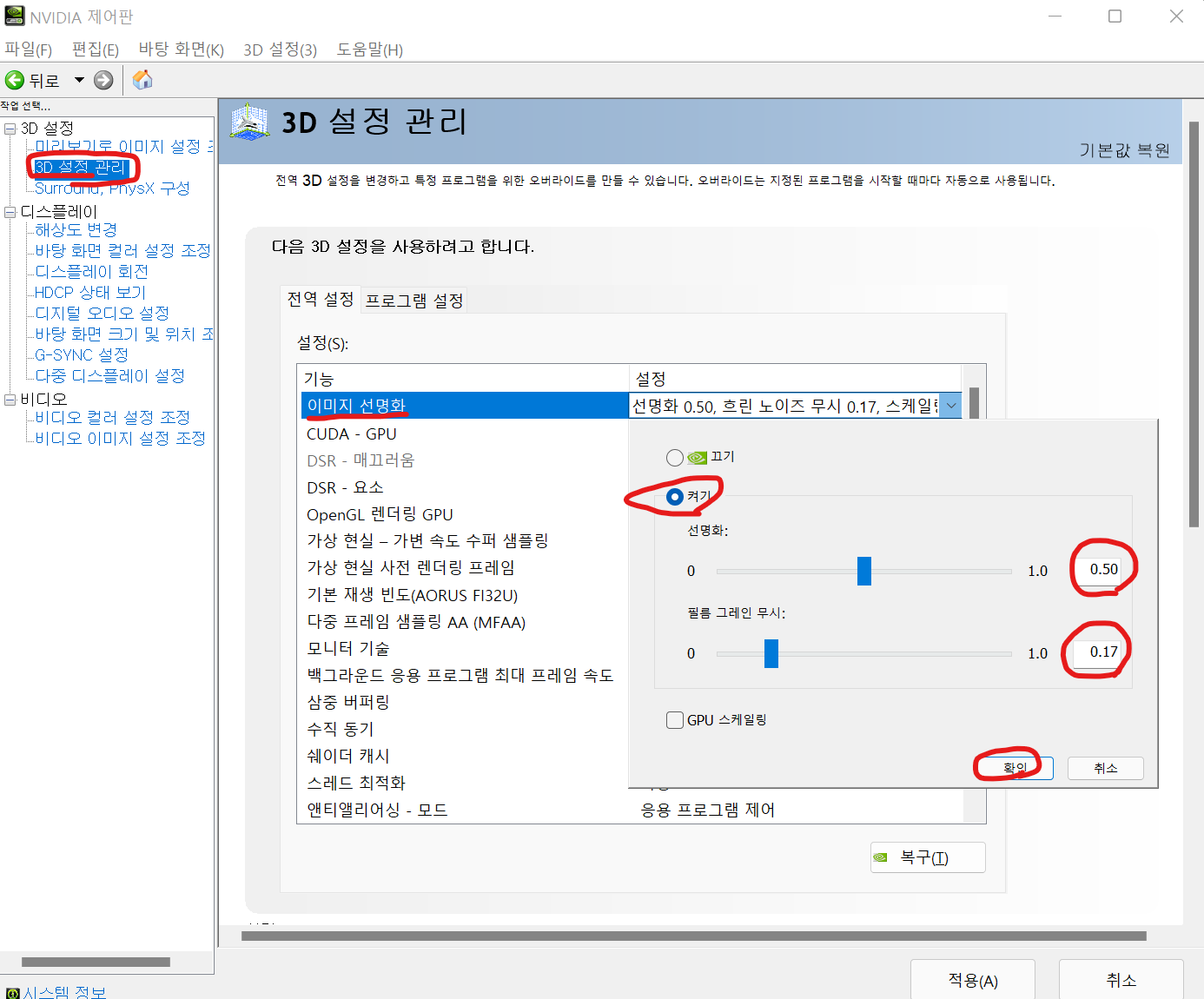 3D 설정 관리 들어가서 이미지 선명화 탭에