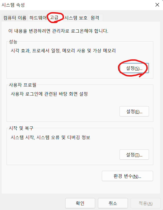 고급 탭에 성능 -> 설정에 들어가자
