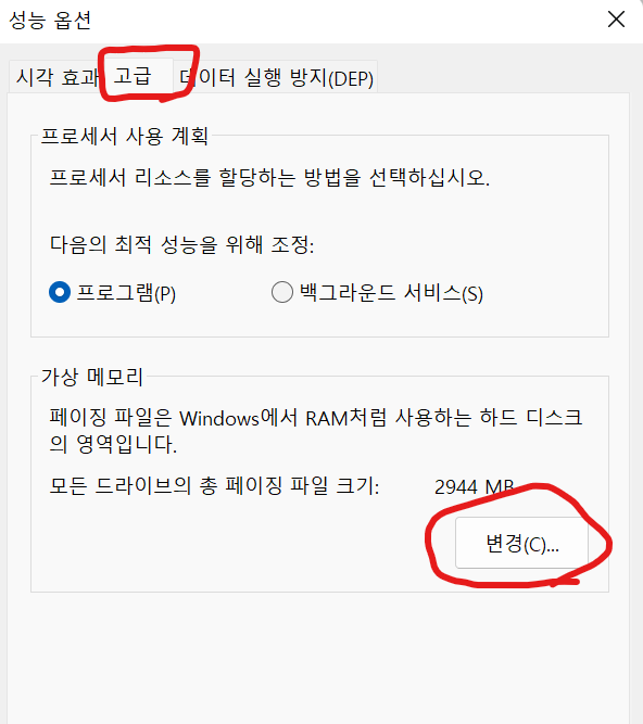 고급 탭에 가상 메모리에서 변경을 눌러주자.